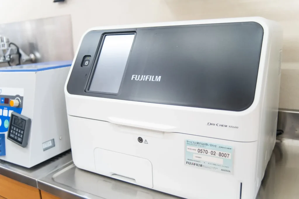血液生化学と電解質を検査する機械で、血液中の酵素や老廃物の測定をおこない、肝臓、腎臓等の検査をおこなったり、電解質の測定をおこない細胞の状態を確認したりする機械です。