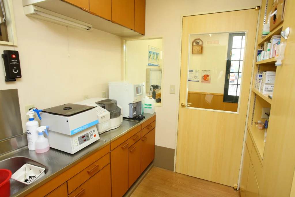 血液検査や尿検査をしたり、薬や注射、ワクチンなどを用意する部屋です。壁がガラスになっているため、診察室から何をしているのかを見ることができます。