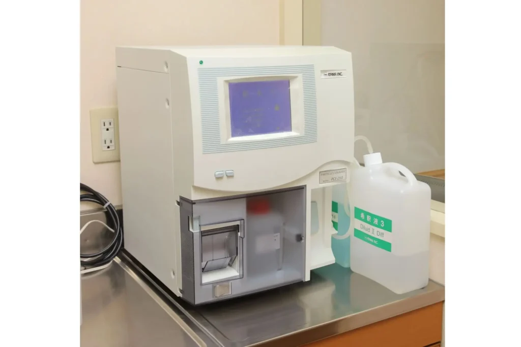 血液中の白血球、赤血球、血小板の数やヘモグロビンの濃度などを測定する機械です。貧血、炎症、血液凝固異常などがないか調べることができます。